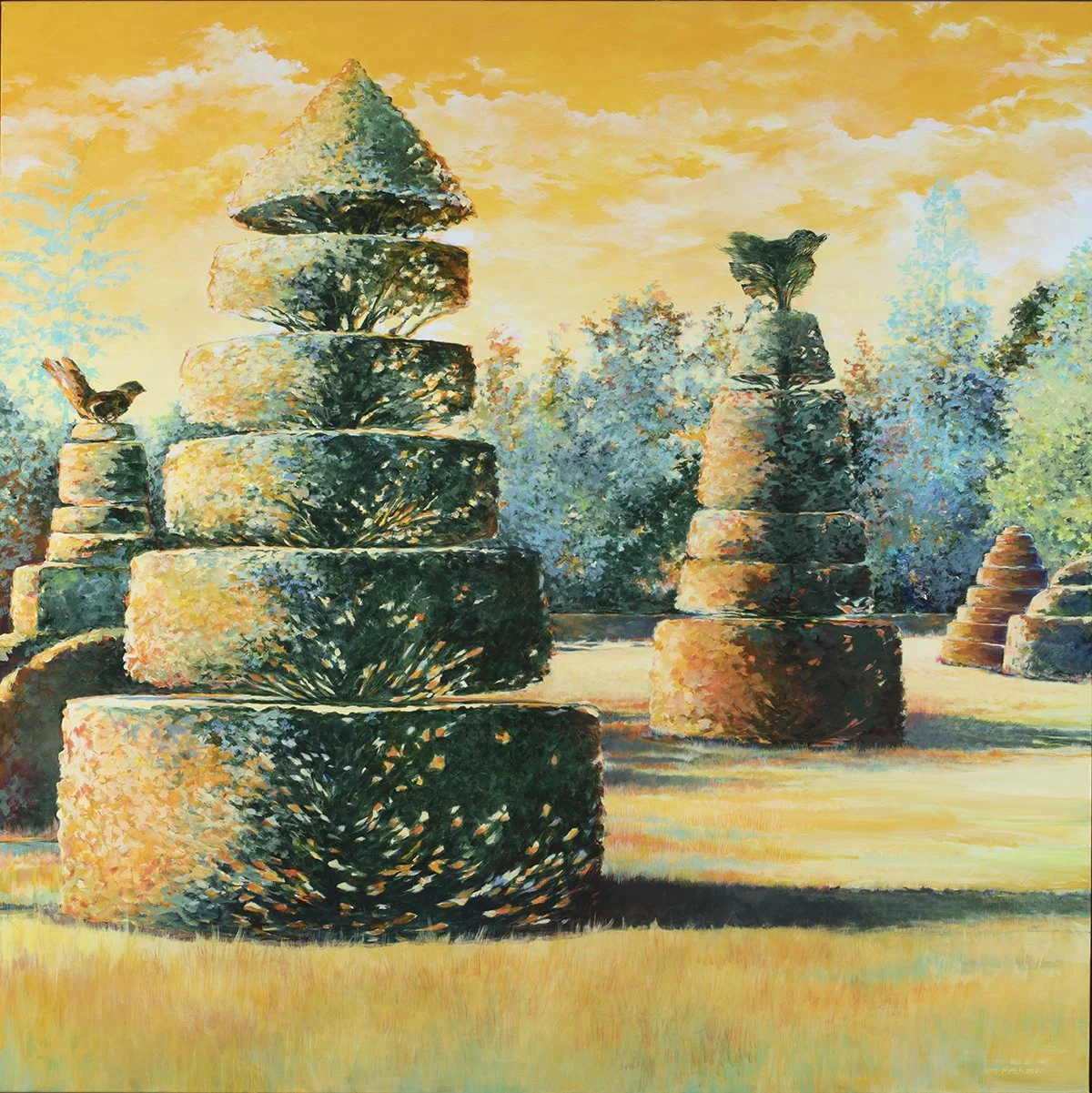 as the basis for her final, painted compositions. These photographs are then cut up and pieced back together to frame the many elements that construct the final composition. This fragmented “sketch” is then used as the blueprint that directs the resulting large-scale works. Hatch’s technique of utilizing her immediate surroundings can be seen throughout the body of work, such as the reflected light shining in Brandywine Blue, or the texture of the manicured trees in Yellow Topiary, a familiar setting from Longwood Gardens.